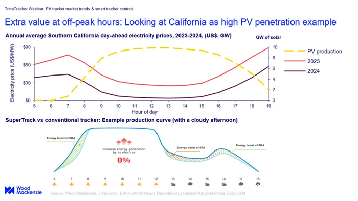 伍德麦肯兹助理研究员Joe Shangraw介绍了智能跟踪技术在全球的需求情况:从地理分布来看,智能跟踪系统在中高纬度地区、弱光照地区及复杂项目地形等场景下需求最旺盛;从政策上讲,智能跟踪系统能够提升早晚弱光时段的发电量,使发电曲线更平滑,对执行波谷电价的区域价值增益尤为显著。