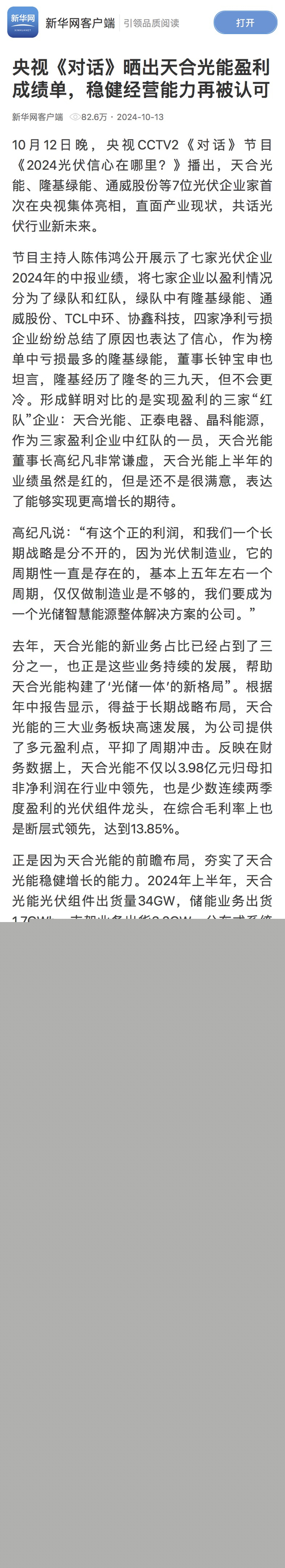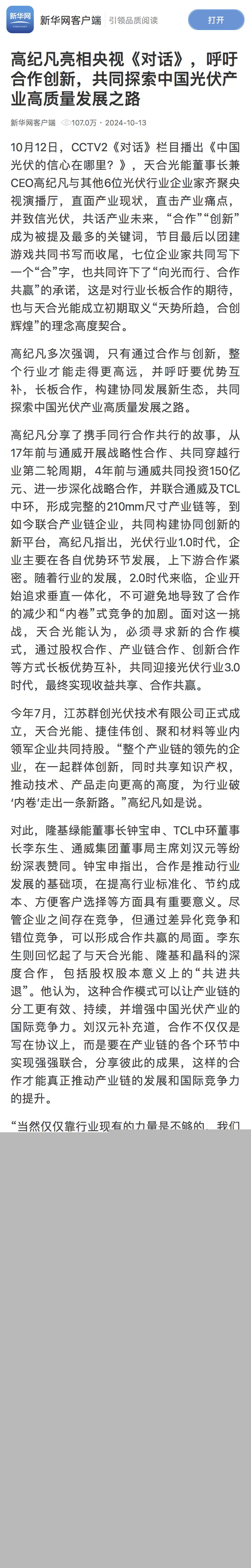 新华网刊发《高纪凡亮相央视<对话>,呼吁合作创新,共同探索中国光伏产业高质量发展之路》,阅读量达107万。