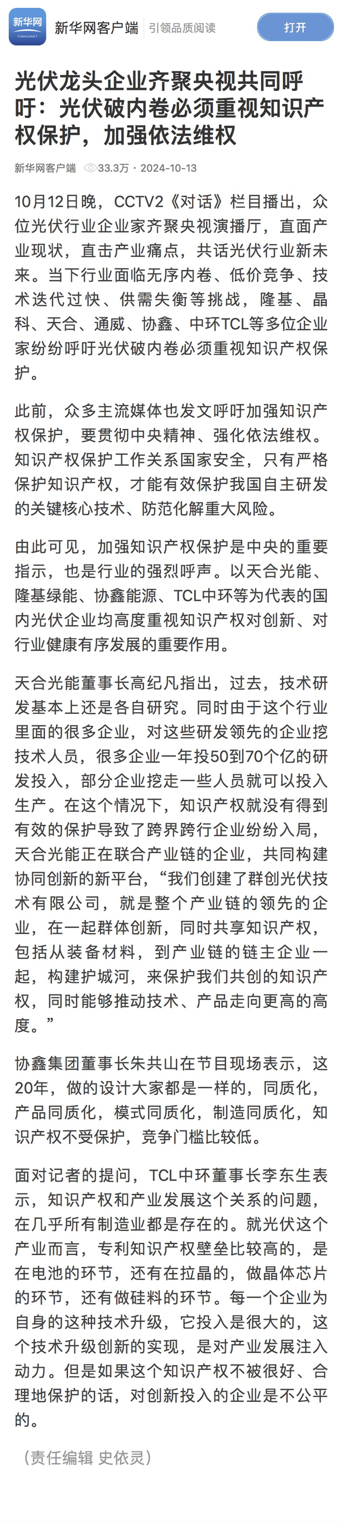 新华网刊发《光伏龙头企业齐聚央视共同呼吁:光伏破内卷必须重视知识产权保护,加强依法维权》,阅读量达33.3万。