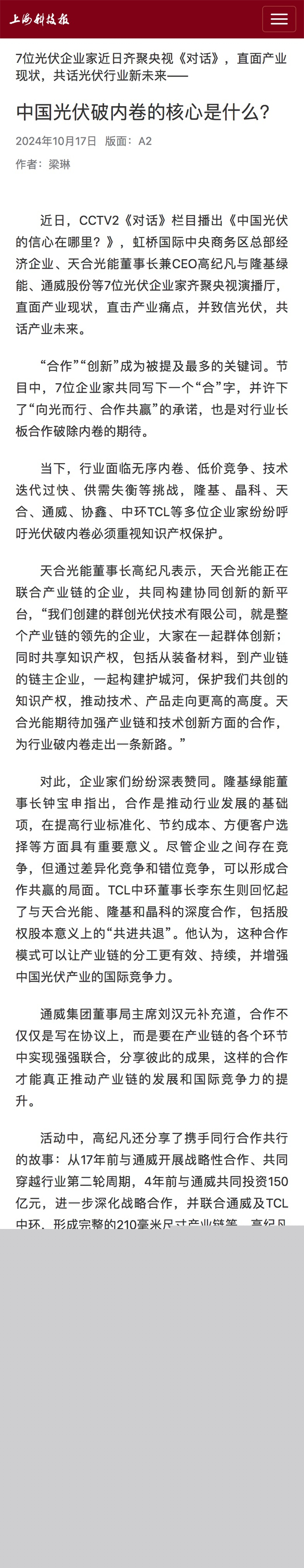 上海科技报刊发《7位光伏企业家近日齐聚央视《对话》,直面产业现状,共话光伏行业新未来——中国光伏破内卷的核心是什么?》。