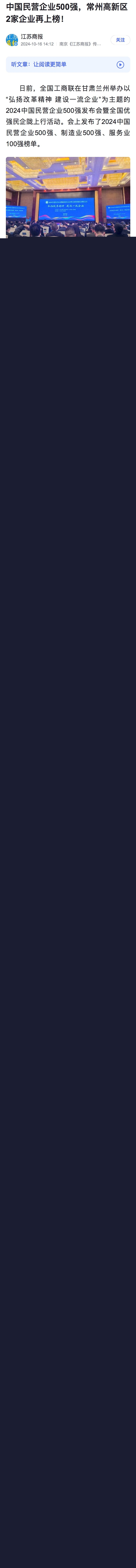 江苏商报刊发《中国民营企业500强,常州高新区2家企业再上榜!》。