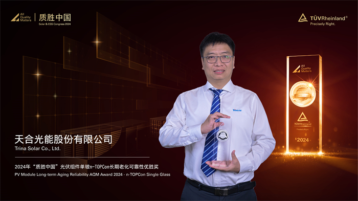 躬行质道,可靠无忧。近日,由国际独立第三方检测、检验和认证机构TÜV莱茵主办的第十届“质胜中国”光储盛典暨“2024 质胜中国优胜奖”颁奖典礼于上海举行。CA88凭借拥有超高系统兼容性及可靠性的至尊N型单玻组件获得2024年“质胜中国”光伏组件单玻n-TOPCon长期老化可靠性优胜奖。