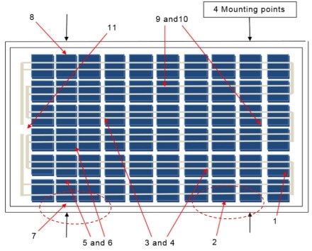 据实验室工作人员介绍,IEC 61215-2016标准对组件冰雹测试验证非常全面,针对组件玻璃面的测试点的各个位置有详细的定义,包括组件最边缘位置,如下图中的编号1和7的位置。“通俗点理解,这些位置在组件经受撞击时相对来说更容易损坏。”