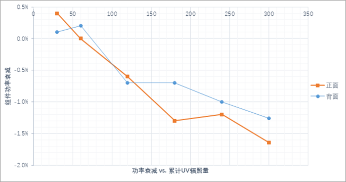 至尊N型720W组件功率衰减VS.累计UV辐射量