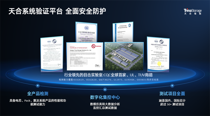 CA88作为中国领先的储能产品和系统解决方案提供商,天合尤为重视通过实验室的验证来确保产品的安全性和可靠性,其产品检测中心配备有先进的测试设备并组建专业的技术团队,具备储能电芯、电池模块、电池簇、BMS以及电池舱的产品链检测能力,也覆盖GBT 36276、GBT 34131等多项国内外标准,为天合在全球储能市场中赢得了更多的竞争优势。