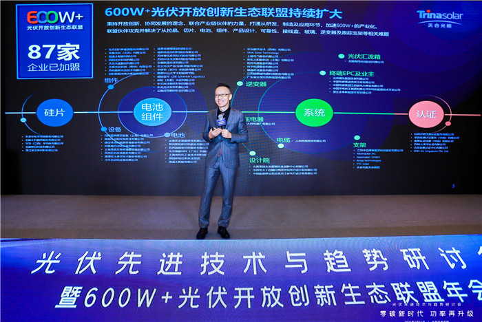 210超高功率组件的量产,成为新赛道的发令枪声。600W+光伏开放创新生态联盟成立一年来,家族成员已从最初的39家成员企业发展壮大为87家,包含电池、组件、逆变器、支架、线缆、背板、玻璃、设计院、EPC、检测认证等全产业链。