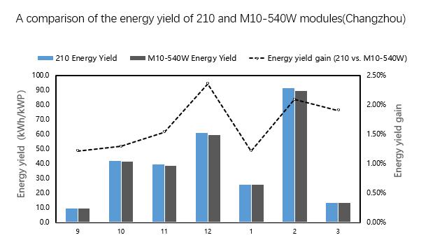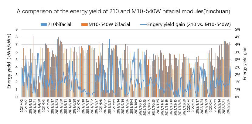 Data from April 2021 to February 2022 showed that the energy yield of the 210 Vertex mono-facial module was 1.7% higher than that of the M10 540W mono-facial module, and the energy yield of the 210 bifacial module was 1.1% higher than that of the M10 540W bifacial module.