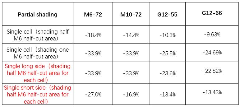 The following table shows the percentage of power degradation for different modules in various shading conditions: