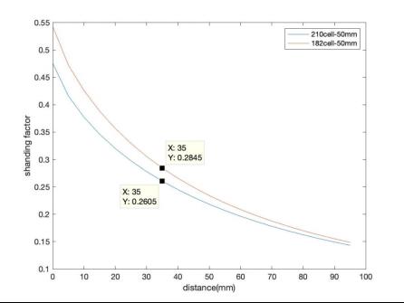 In the application of bifacial modules, there will be beam crossing on the back side of the modules for some projects. Taking the 50mm purlin as an example, when the distance of purlins is at 35mm to cells, the equivalent shading loss of back side irradiation for 210 half-cut cells is 26.1%, and for 540W modules 28.5%.
