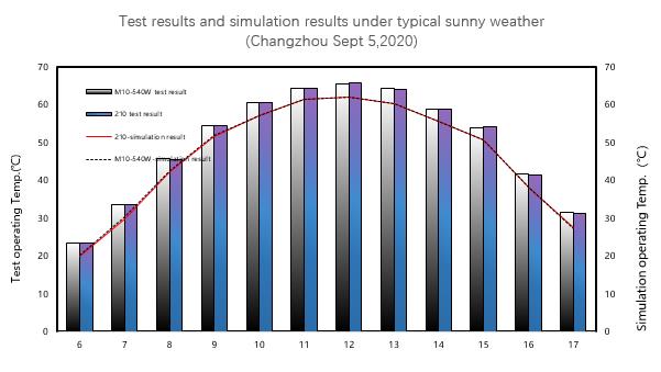 The data of September 5 was selected because the day was typically sunny and the measured data and measured meteorological data were substituted into the steady-state heat balance model. The measured and simulated results are compared with the following figure. It can be seen that the operating temperature of the 210 Vertex module and the M10 540W module are basically the same.