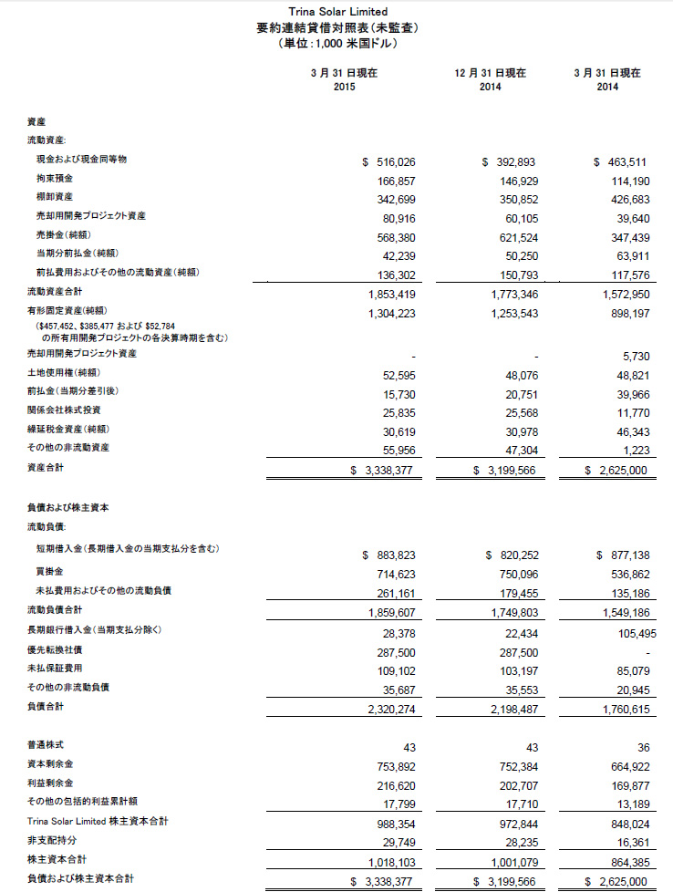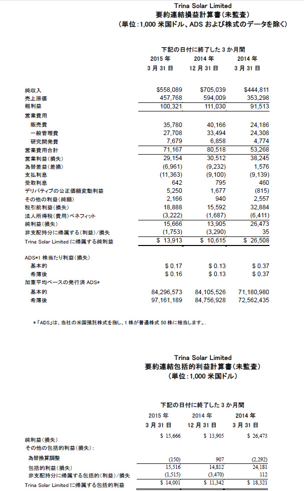 常州(中国)発2015年5月21日/PRNewswire/ -- 太陽光電池(「PV」)のモジュール、ソリューションおよびサービスにおいて世界のPV業界をリードするTrina Solar Limited(NY証券取引所:TSL)(「トリナ・ソーラー」または「当社」)は本日、2015年第1四半期の決算報告を発表しました。