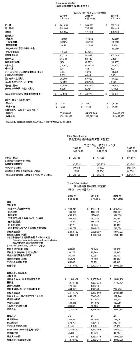 およびサービスにおいて世界のPV業界をリードするTrina Solar Limited(NY証券取引所:TSL)(「トリナ・ ソーラー」または「当社」)は、2016年9月30日締め第3四半期の決算報告(未監査)を発表しました。
