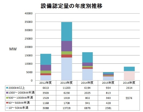 新制度に移行した未稼働案件を消化するため、今後3年程度、10GW程度の設備市場が続くといっても、新規の認定量が激減すれば5~6年後に設備市場はパタッとなくなる。そうした視点から、気になるのが新規の認定量の推移だ。
