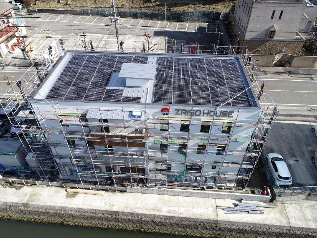 建設中のザイソウ正木ビル。屋根全面に23.7kWの太陽光発電パネルを並べた(写真:材惣DMBホールディングス)