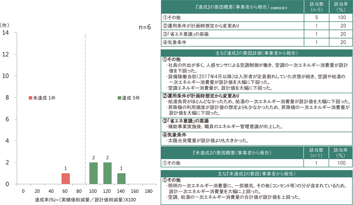 事業者からは達成の理由として、「エネルギー計測の見える化が省エネ意識向上につながった」という声や、「空調切り替え時期や室温の設定値の調整、照明運用設定が奏功した」「省エネ会議を実施し予実管理を徹底した」などの報告があった。