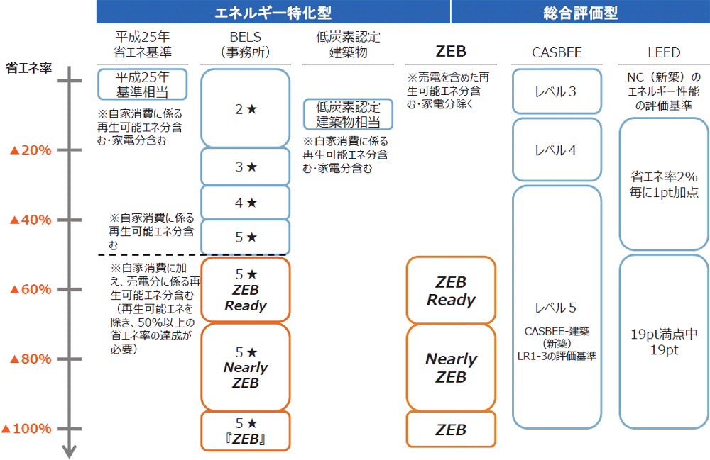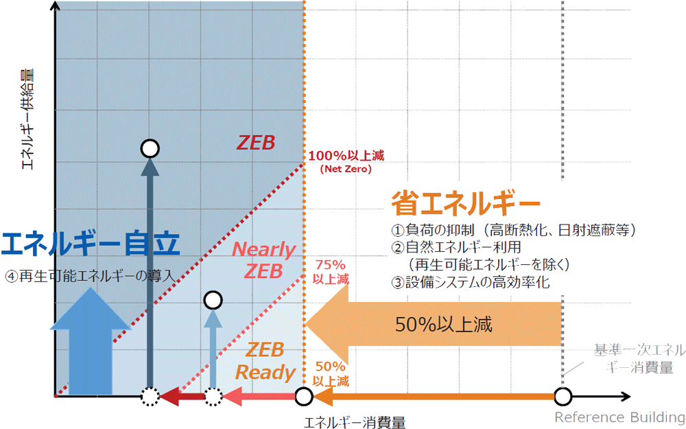 ZEBと省エネ基準などとの関係は下図の通りだ。