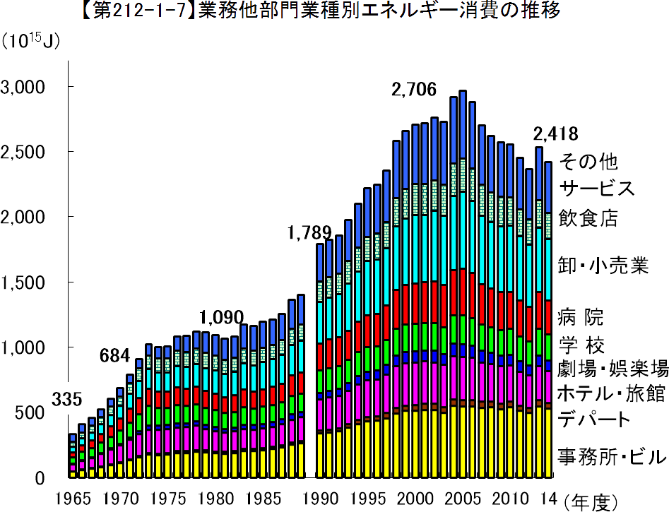 業務その他部門の業種別エネルギー消費の推移。事務所・ビル、卸・小売業のシェアの増加が目立つ。なお、「総合エネルギー統計」では1990年度以降、数値の算出方法が変更されている(資料:資源エネルギー庁「平成27年度エネルギーに関する年次報告(エネルギー白書2016)」)