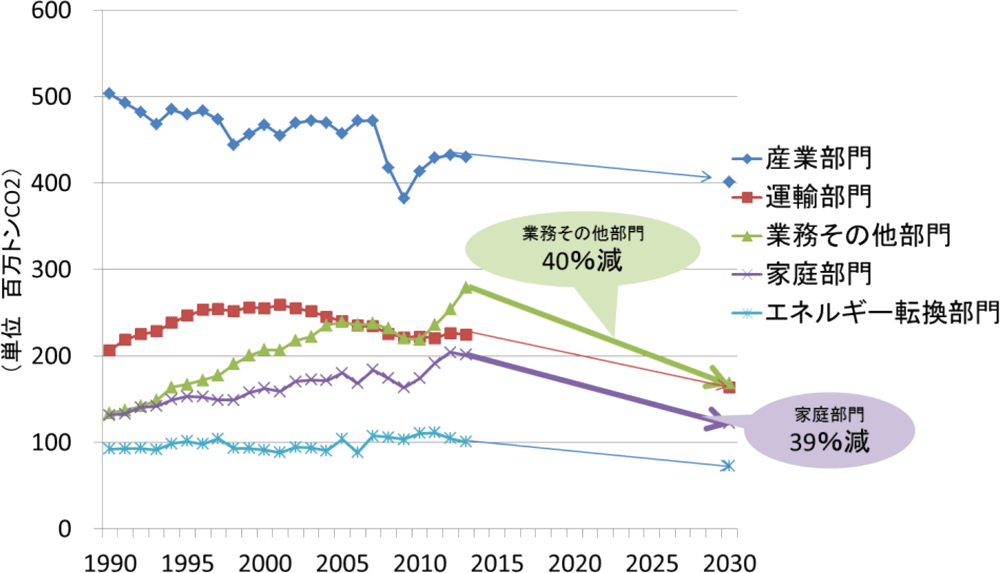 COP21に先立って、日本が提出した「日本の約束草案」では、民生部門において、温室効果ガスを13年度比で約40%大幅削減する目標を定めている。
