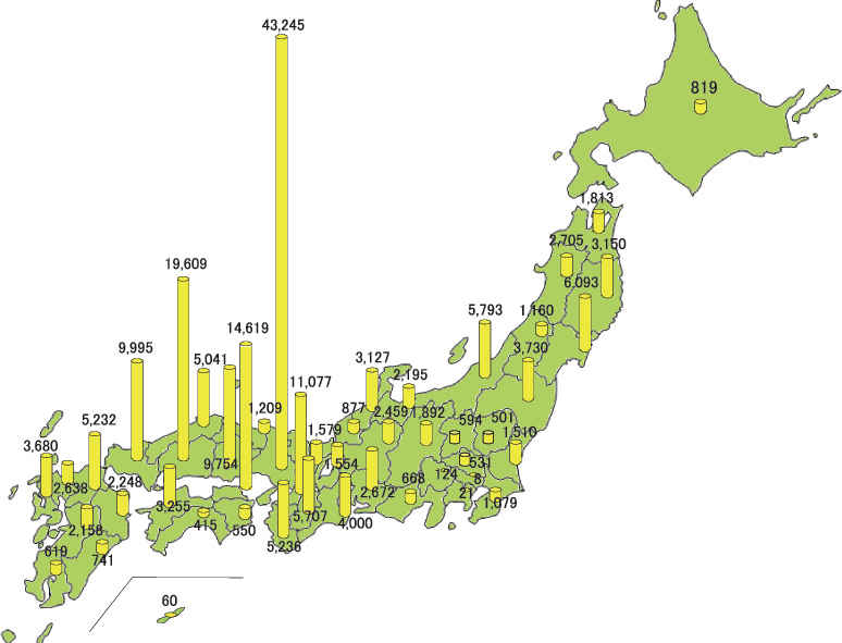 兵庫43,245、 広島19,609、 香川14,619と、西日本に多く存在(平成26年3月時点)