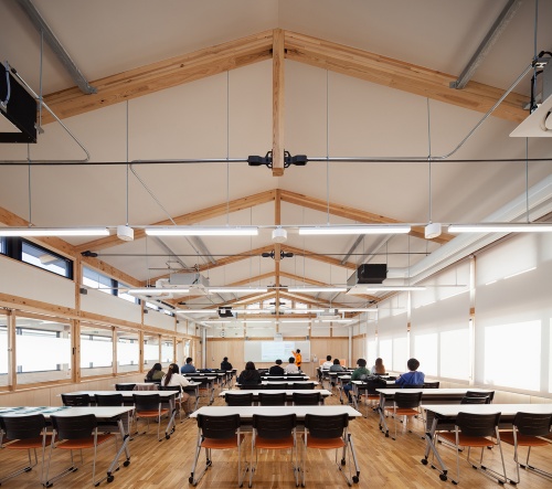 教室内観。登り梁(のぼりばり)と丸構の下弦材で構成した張弦梁を架けて、梁間8.4mの大空間を設けた(写真:吉田 誠)