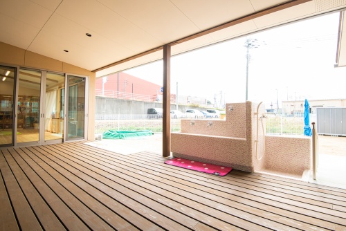 保育室に続く半屋外のウッドデッキ(写真:エコワークス)