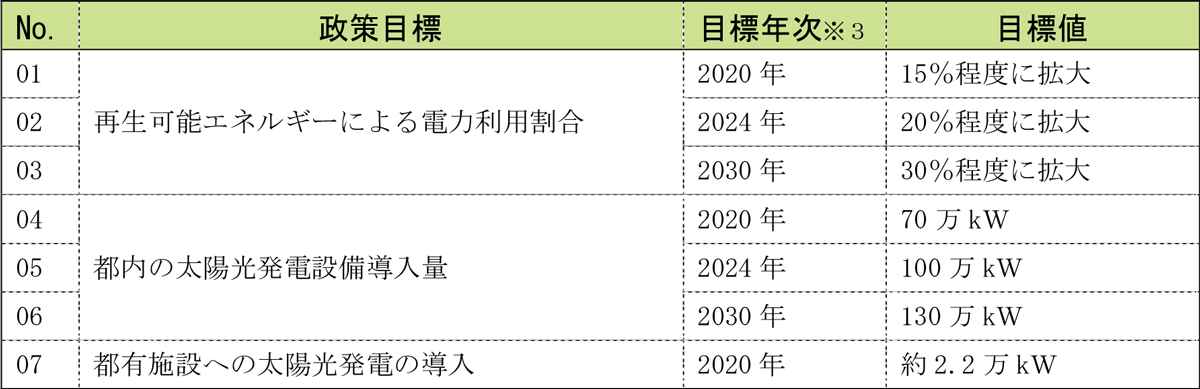 東京都の再生可能エネルギーの導入目標。年次は暦年で表示しているが集計などは年度単位で実施(資料:東京都)