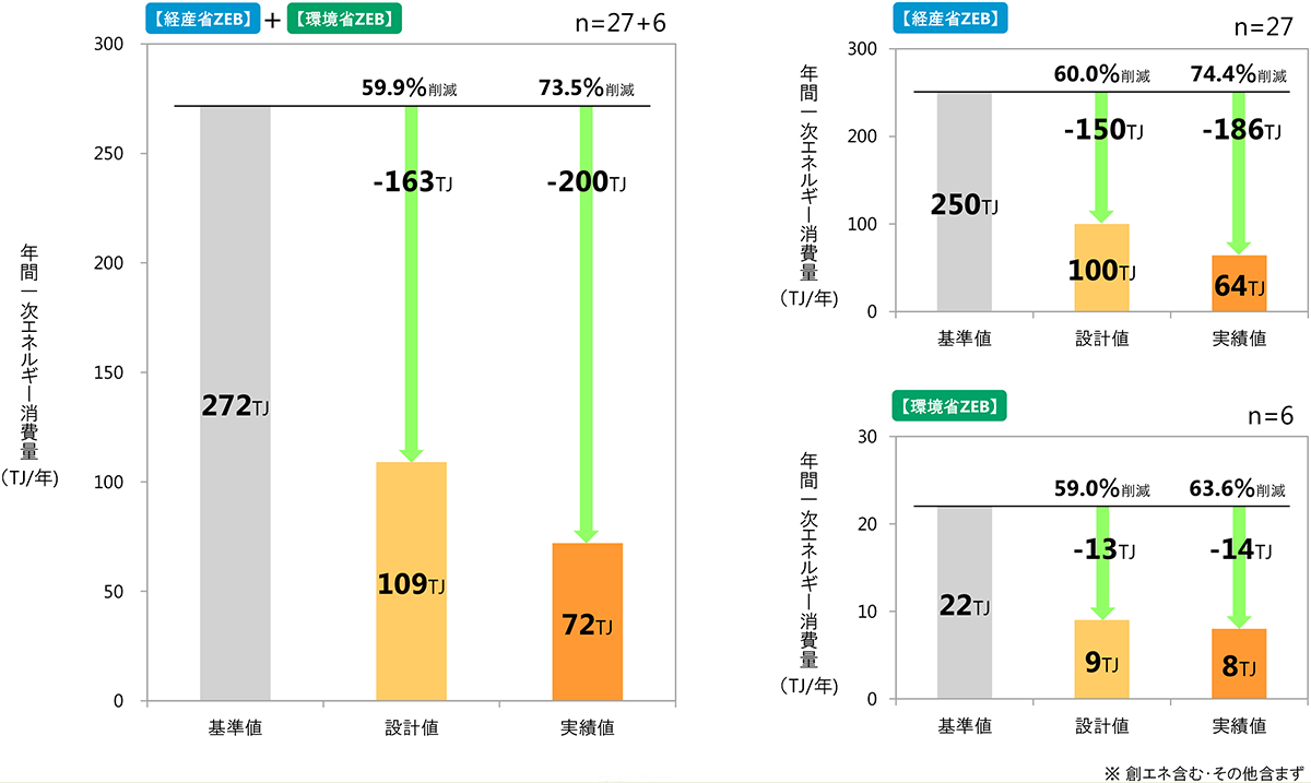 建物の完成後に規定通りの運用を行えば性能が確保できるよう、建築研究所がホームページなどで公開している計算支援プログラムはやや厳しめに設定されています。ZEB実証事業の33件の集計データを見ると、実際、設計値より10%以上もエネルギー消費量が減っています(下のグラフを参照)。建築側からすると望ましい結果といえますね。