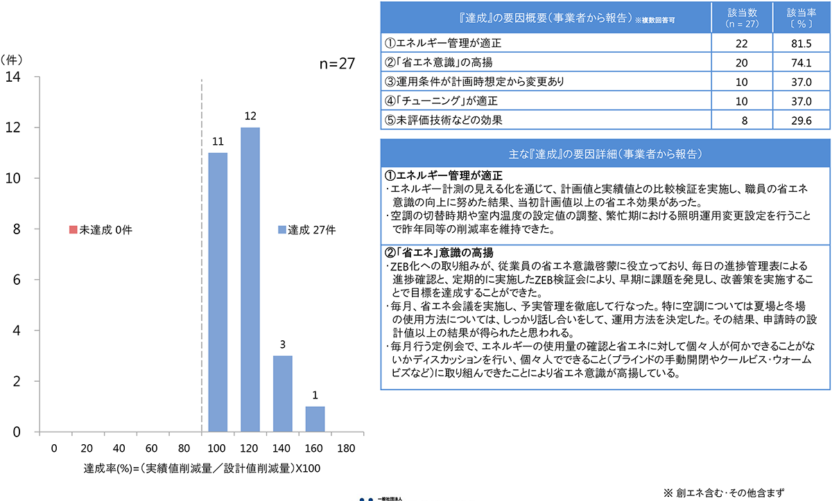 年間一次エネルギー削減量の達成率と「達成」の要因。分析対象はエネルギー計算手法が「平成25年(2013年)基準」以降の経産省ZEB実証事業27件(事務所8件、老人・福祉ホーム7件、病院4件、百貨店3件、マーケット2件、官公庁、旅館、体育館など各1件)。対象建築物全体のエネルギー使用量(電力、ガス、灯油など)の従量およびBEMSによるエネルギー計測データを集計。計測期間は2017年4月1日~18年3月31日(資料:環境共創イニシアチブ)