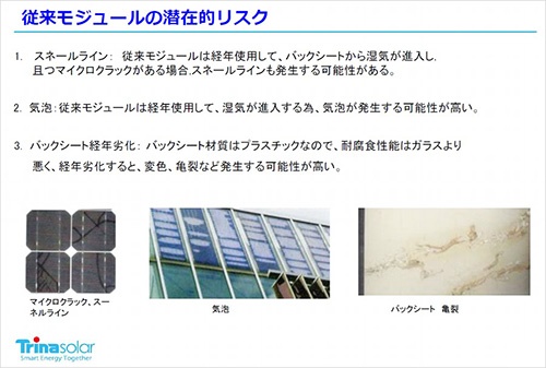 スネイルラインの発生によって、発電量が低下するかどうかが最大の問題となる。トリナ・ソーラーの分析によると、スネイルラインの発生後、すぐに発電量が大幅に減少することはない。ただし、発電量が完全に落ちないとは言い切れない。さまざまな耐久試験による数値を見ると、発電量の低減を示す結果は得られていない。その為に両面ガラス構造にすることで長期の信頼性がさらに向上すると考えられている。