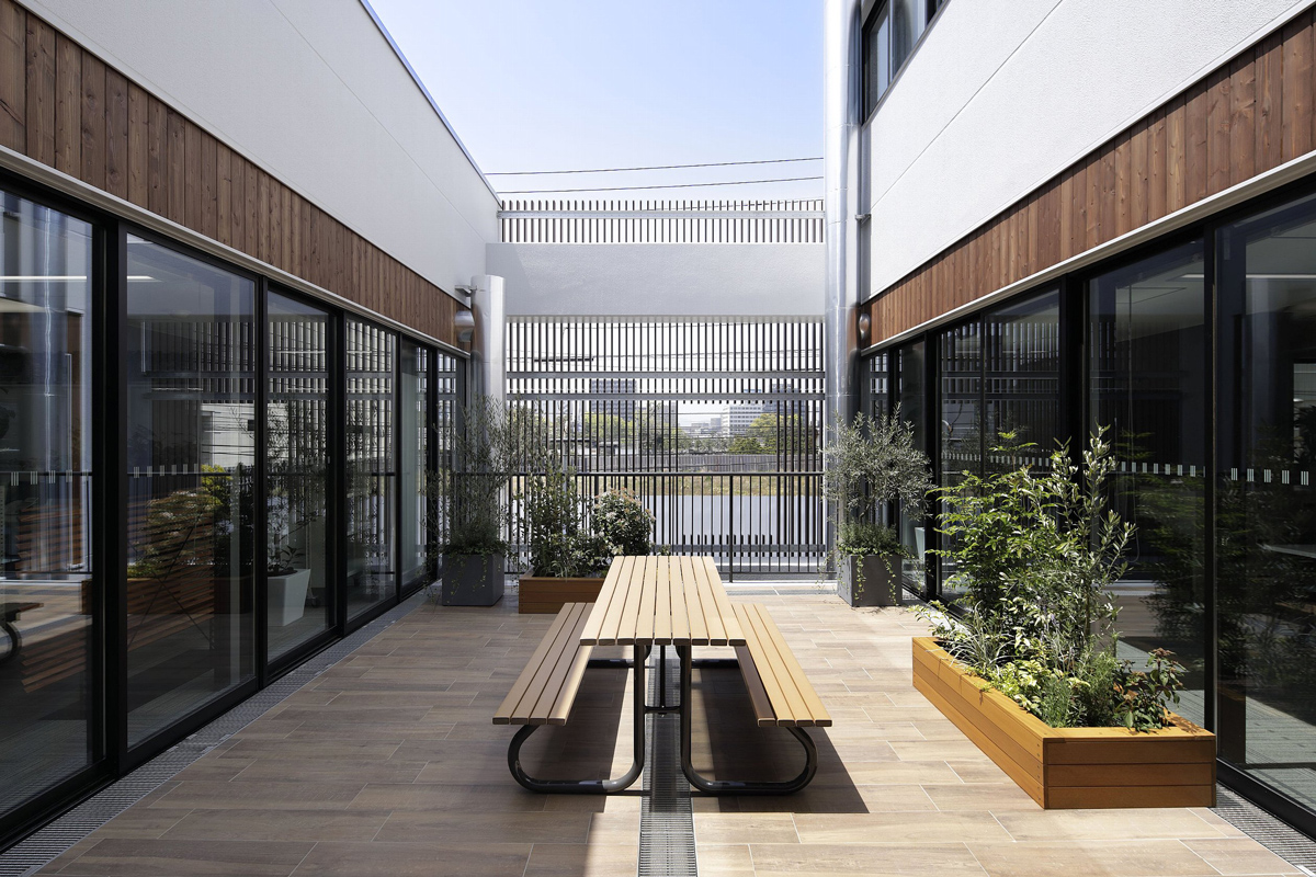 2つの事務室に挟まれた2階の中庭バルコニー(写真:ダイダン)