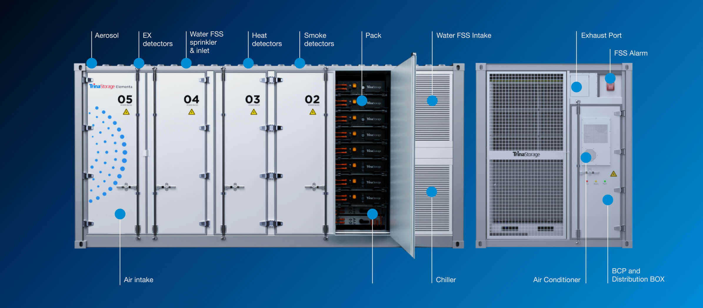 Elementa 2 features a 4.07MWh and 5 MWh capacity and state-of-the-art 306 and 314Ah Trina LFP cells incorporating high safety, performance, and cyclic lifetime. Integrated into an upgraded battery pack design, energy density increases by up to 16%, with optimizations for thermal and battery management.