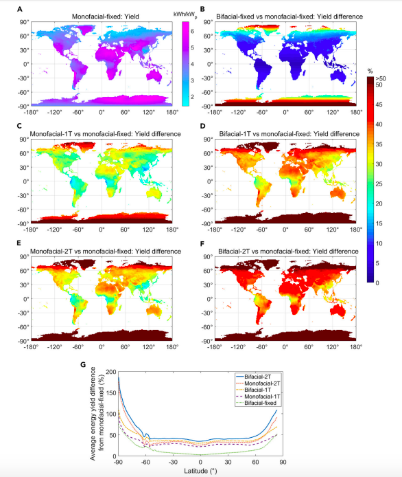 Caption: (A) Daily average energy yield for the monofacial fixed-tilt installation. The following plots present the percentage difference between the energy yield (with respect to monofacial fixed-tilt) for (B) bifacial-fixed, (C) monofacial-1T, (D) bifacial-1T, (E) monofacial-2T, and (F) bifacial-2T. In (G), the average energy yield difference for the different systems with respect to the monofacial fixed-tilt reference is shown (the presented values are the average from all the analyzed longitude locationss at a particular latitude).